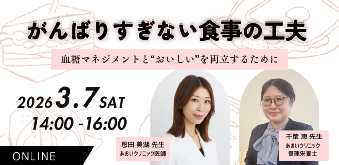 このオンラインセミナーでは、「楽しみながら続けられる食事」をテーマに、あおいクリニックの医師・恩田美湖先生と、同じくあおいクリニックの管理栄養士・千葉恵先生をお招きし、日常で役立つ工夫や考え方を分かりやすくお伝えします。