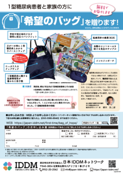 日本IDDMネットワークは、発症まもない患者・家族のみなさんに希望をもって生活してほしいという想いをこめて、2014年11月より1型糖尿病患者向け「希望のバッグ」プロジェクトを開始しました。患者・家族のみなさんが抱く不安をやわらげ、病気に立ち向かうための知識や情報をまとめたツールを「希望のバッグ」に入れてみなさんの手元にお届けします。