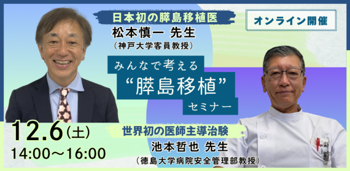 みんなで考える”膵島移植”セミナー 2025年12月6日(土)14:00~16:00 個別相談会(6組限定) 2025年12月6日(土) <松本先生> 16:15~16:30/16:35~16:50/16:55~17:10 <池本先生> 16:15~16:30/16:35~16:50/16:55~17:10 |