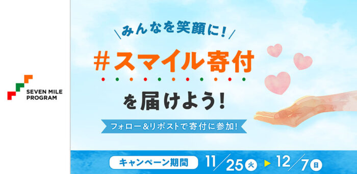 通常のセブンマイルプログラムでのご寄付に加えて、期間限定での寄付キャンペーン「スマイル寄付キャンペーン」が今年も始まります!