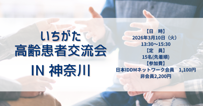 | 対象 | 50歳以上の1型糖尿病患者、その家族 | 参加費 | <患者・家族> 日本IDDMネットワーク会員 1,100円/ 非会員 2,200円 ※領収書をご希望の方は、Peatixにてお手続きください。発行方法はこちらをご覧ください。 |