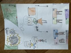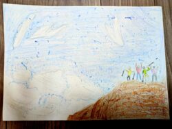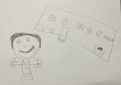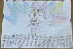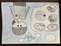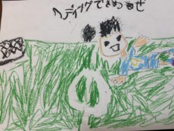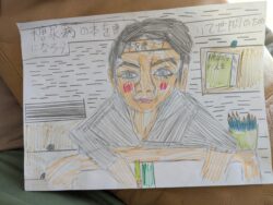 1型糖尿病が治ったら何したい?と聞いたら「1型を治してくれた人がいるなら、今度は俺が誰かの病気を治したい」と。手を広げて笑っている人は大きくなってお医者さんになった自分。右上の建物は病院だそうです。締切の何日も前に描き終わり色を塗るのを待ちましたが、本人が白黒でいい!ということでこのまま出します。