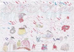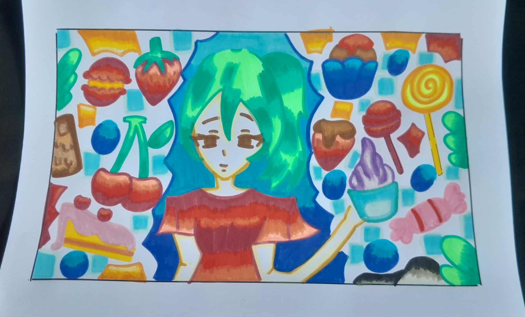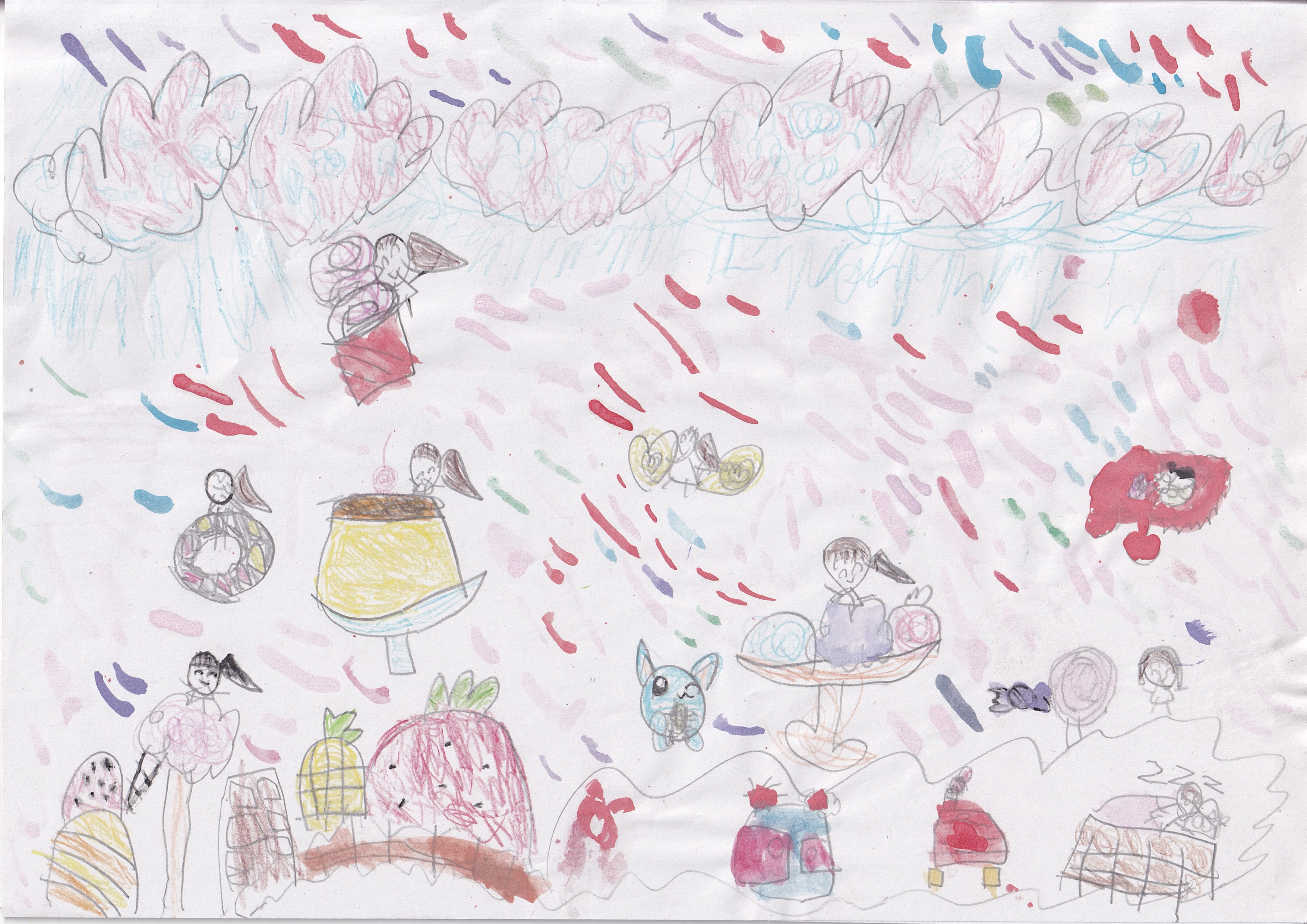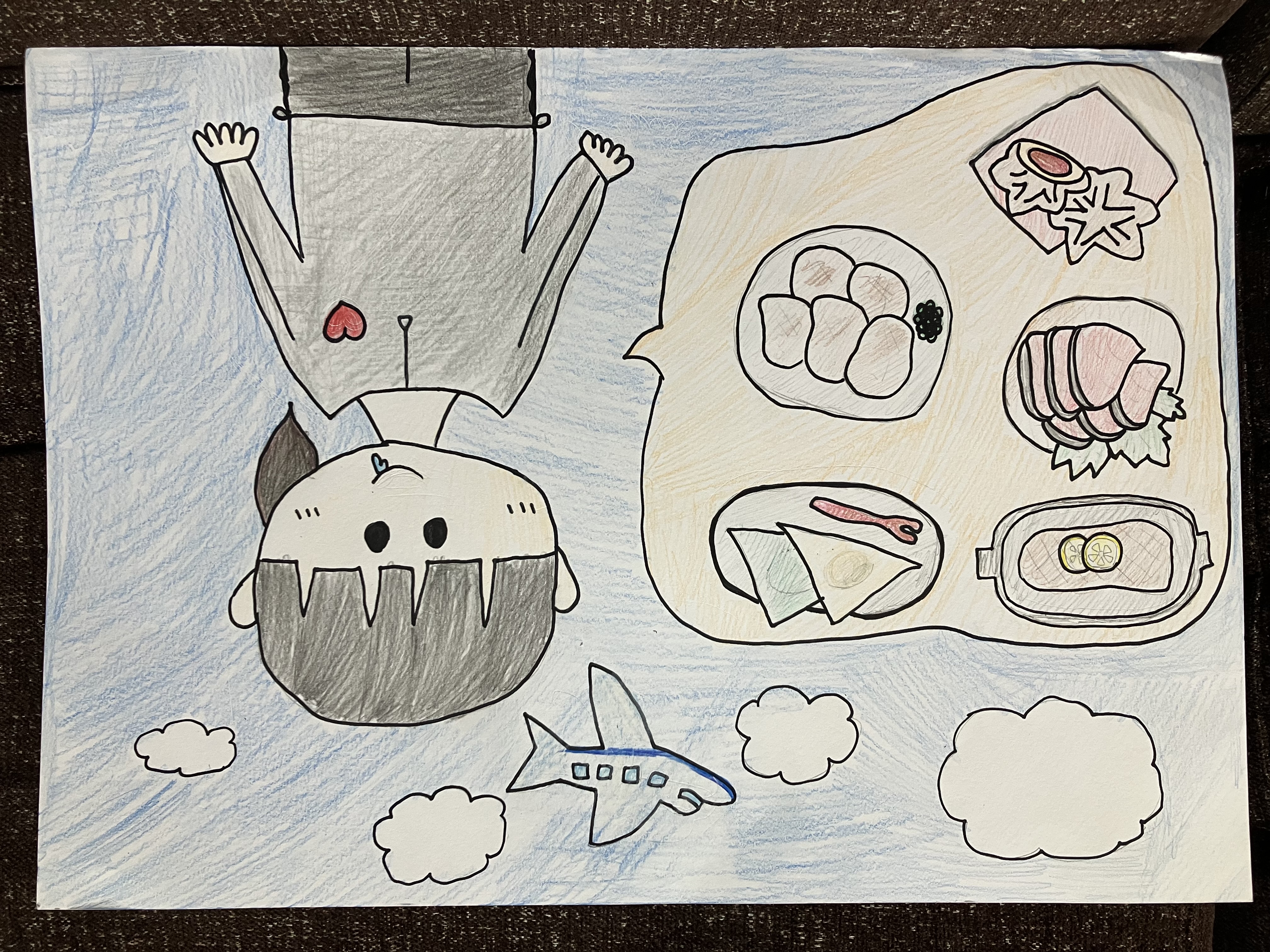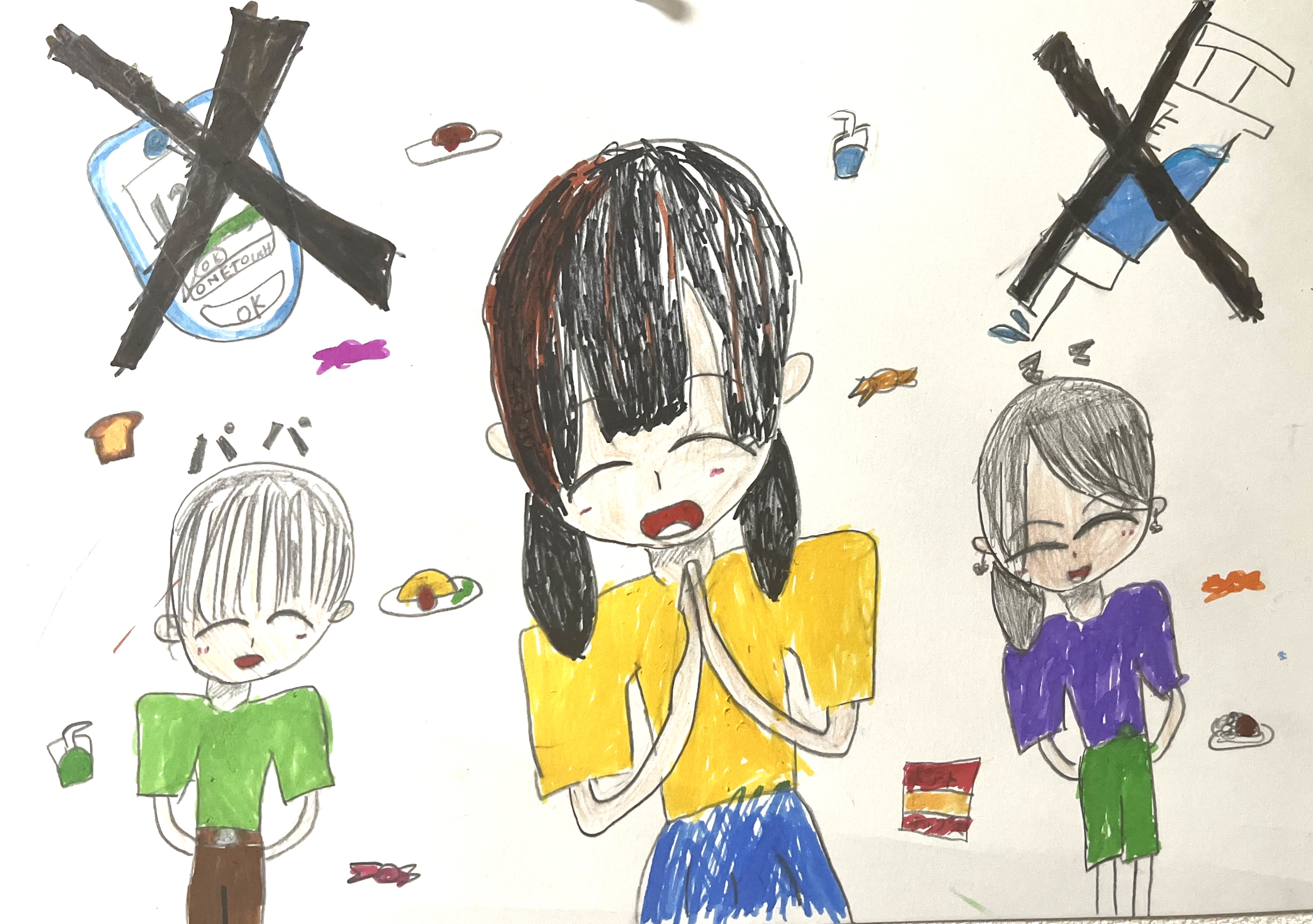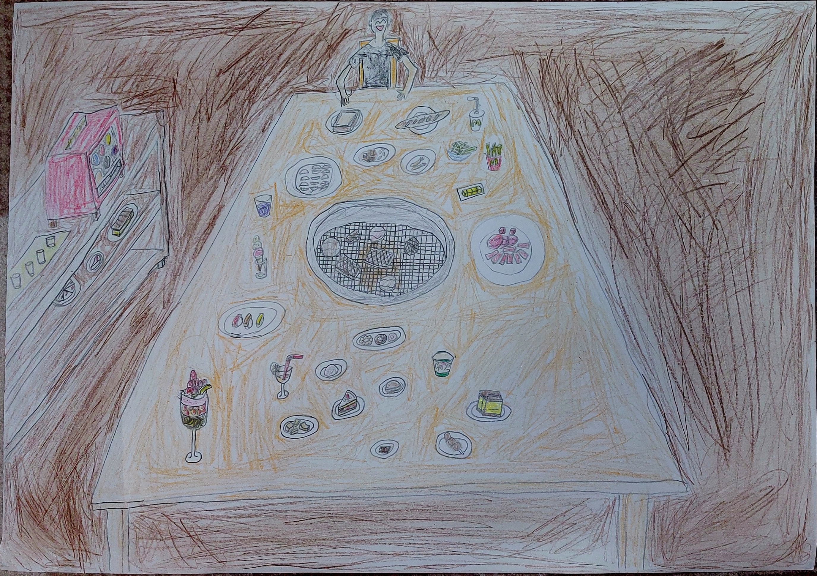 1型糖尿病だから炭水化物の量を計算しないといけないけど、1型糖尿病が治ったら計算せずに自由に食べられるから、夢のような量の食べ物を見て、「一度でもいいから自由に食べてみたかった。」という気持ちになりたいと思ってこの絵をかきました。