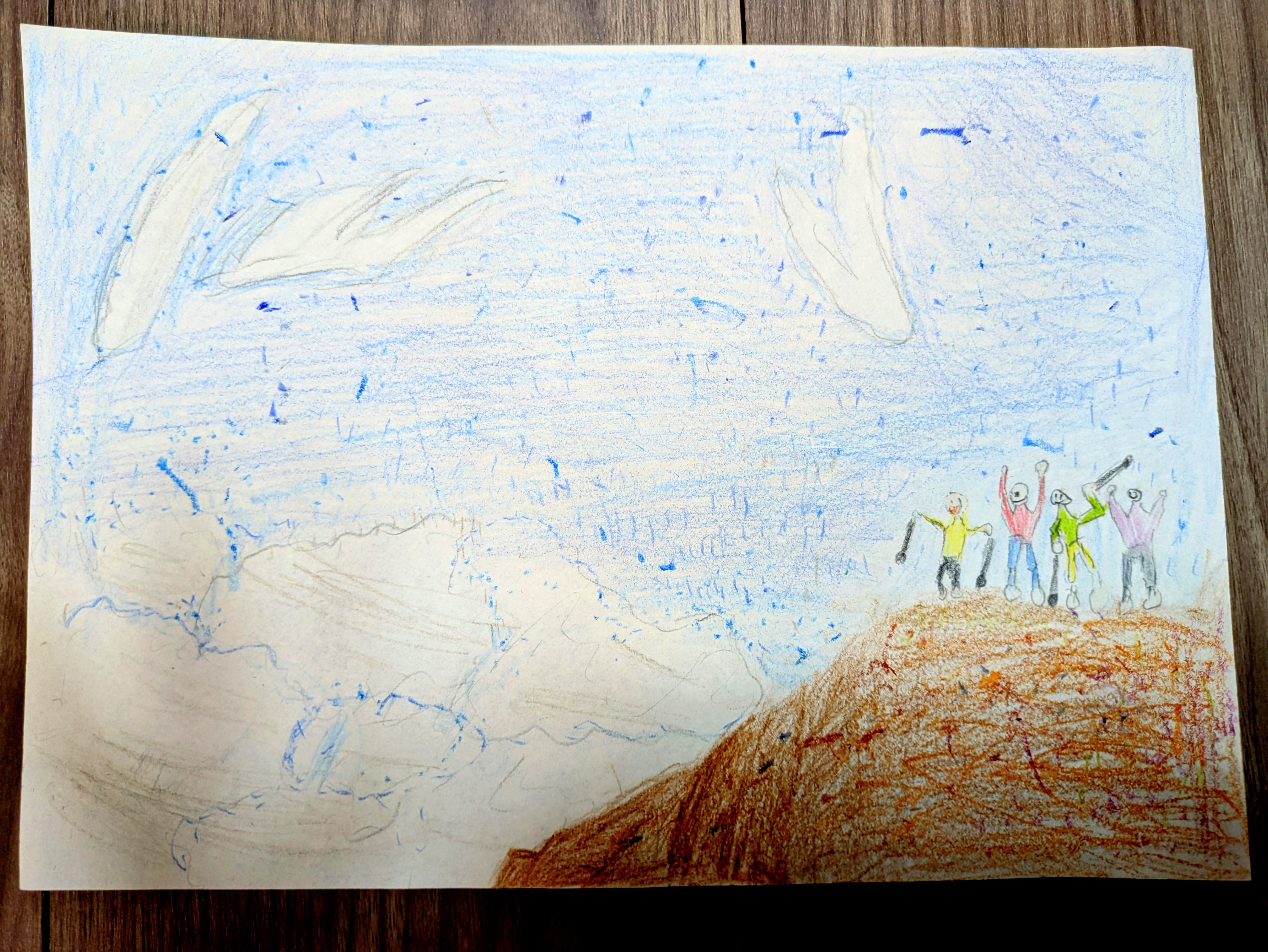 持ち運びなどを全く気にせず、家族みんなで富士山に登ってる絵を描きました。