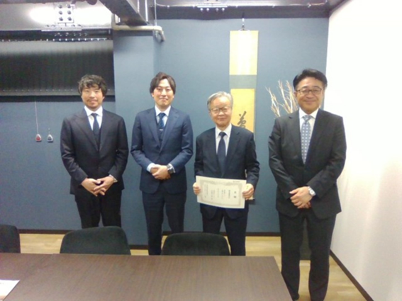 ※写真左より 株式会社エイチツー 専務取締役 長谷 悟様、代表取締役 濵條 隆行様、認定特定非営利活動法人日本IDDMネットワーク会長 井上 龍夫、株式会社名古屋銀行 港支店 支店長 山本 直文様