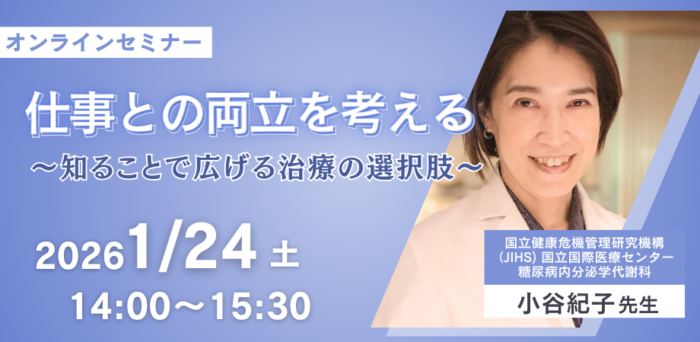 ご自身も1型糖尿病をもちながら医師として活躍されている小谷先生に、働く世代の方々が抱えるリアルな課題や、最新の治療法・テクノロジーの活用、そして治療とキャリアの両立に向けた工夫についてお話しいただきます。